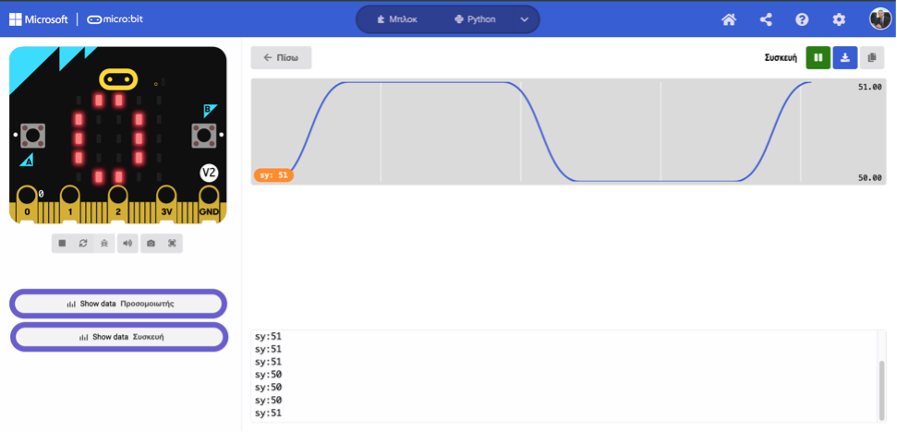 Displays the measurement value on the micro:bit LED panel and assigns the corresponding values to the variable sy which is represented in the diagram of the axes x=sampling time and y=measurement (see next screenshot).